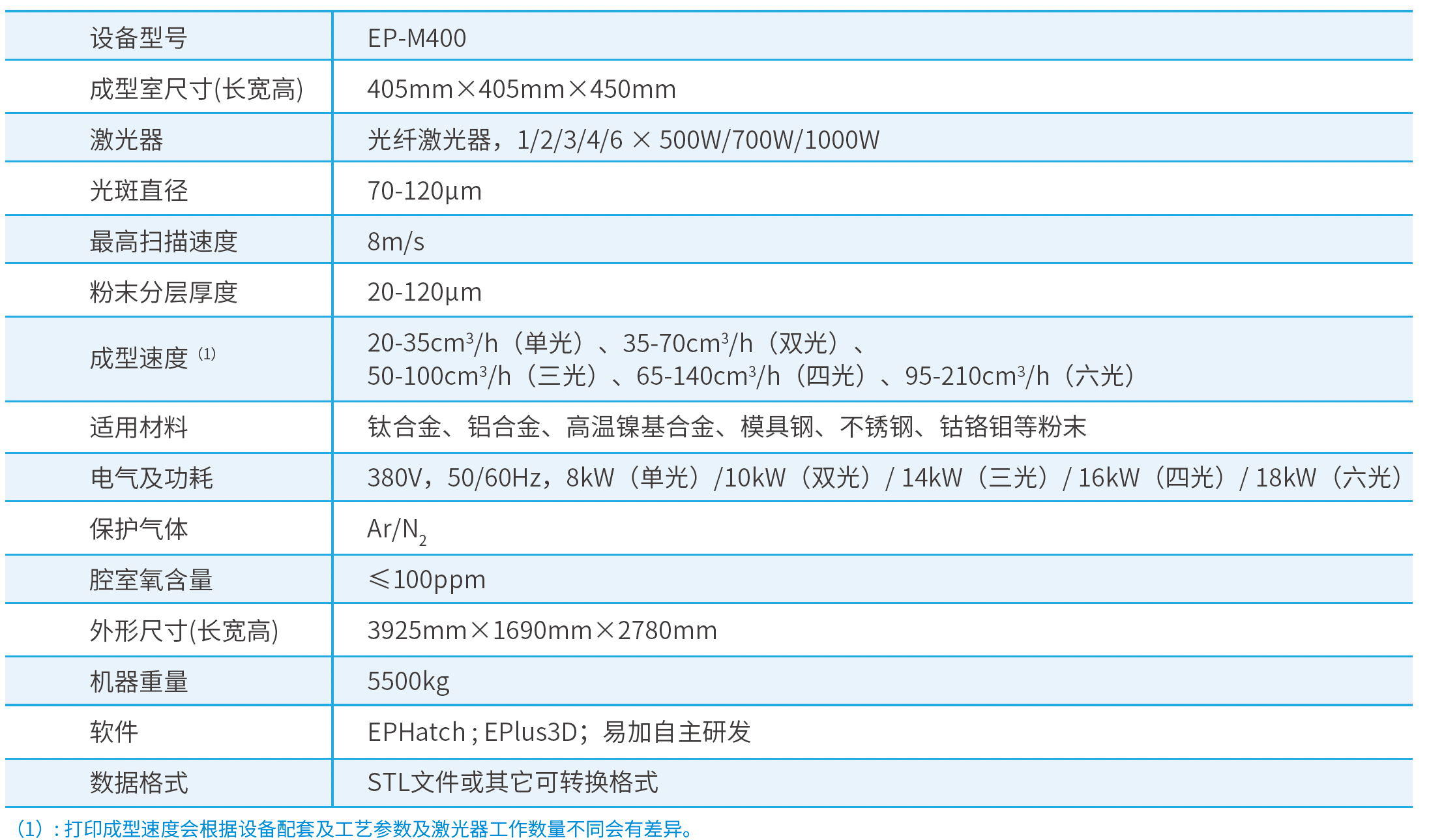 EP-M400 的成型室尺寸可达 405*405*450mm³ ,有单激光、 双激光、三激光、四激光、六激光五种配置可选,可打印钛合金、铝合金、高温镍基合金、模具钢、不锈钢、钴铬钼等材料,适于航空航天、模具等领域大尺寸、高精度、高性能零部件的直接制造。