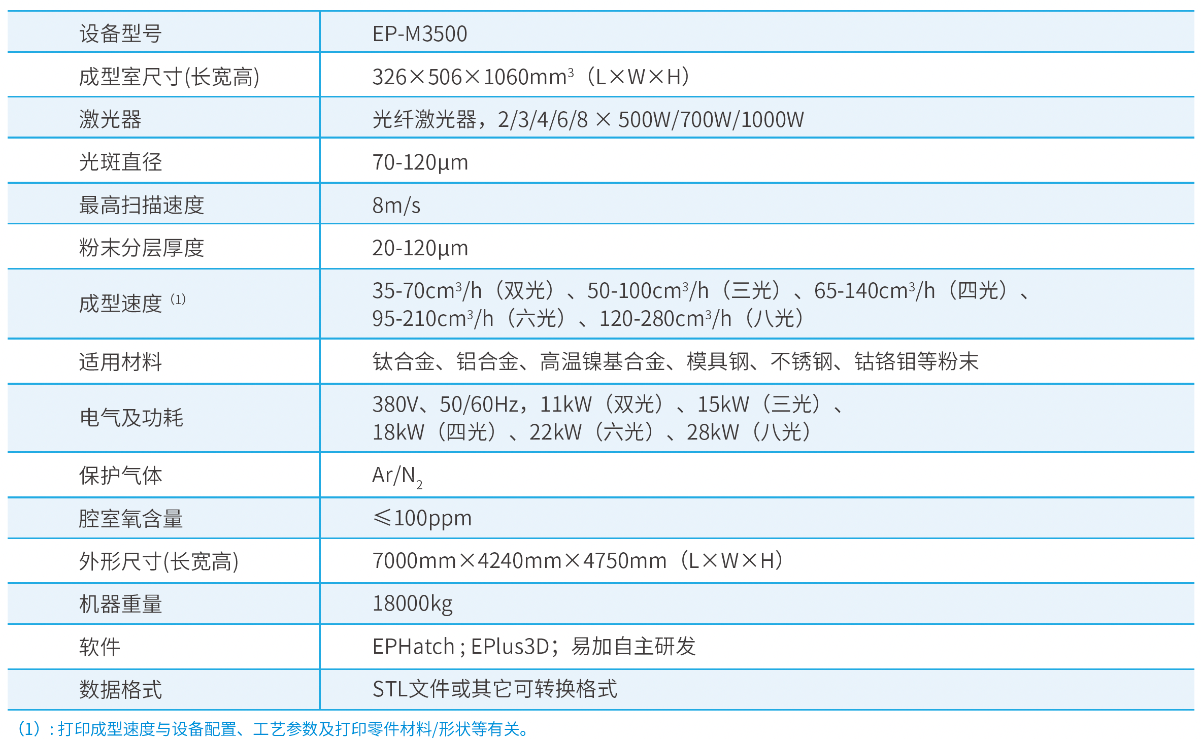 EP-M3500 的成型室尺寸可达 326mmx506mmx1060mm ,有双激光、三激光、四激光、六激光、八激光五种配置可选,可打印钛合金、铝合金、高温镍基合金、模具钢、不锈钢、钴铬钼等材料,适于航空航天、模具制造、汽车工业等领域大尺寸、高精度和高性能零部件的直接制造。